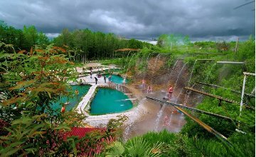 На территории, кроме стекающих по желобам струй воды, которые делают приятный "гидромассаж" есть три бассейна с разной температурой - от очень горячей до умеренно теплой.