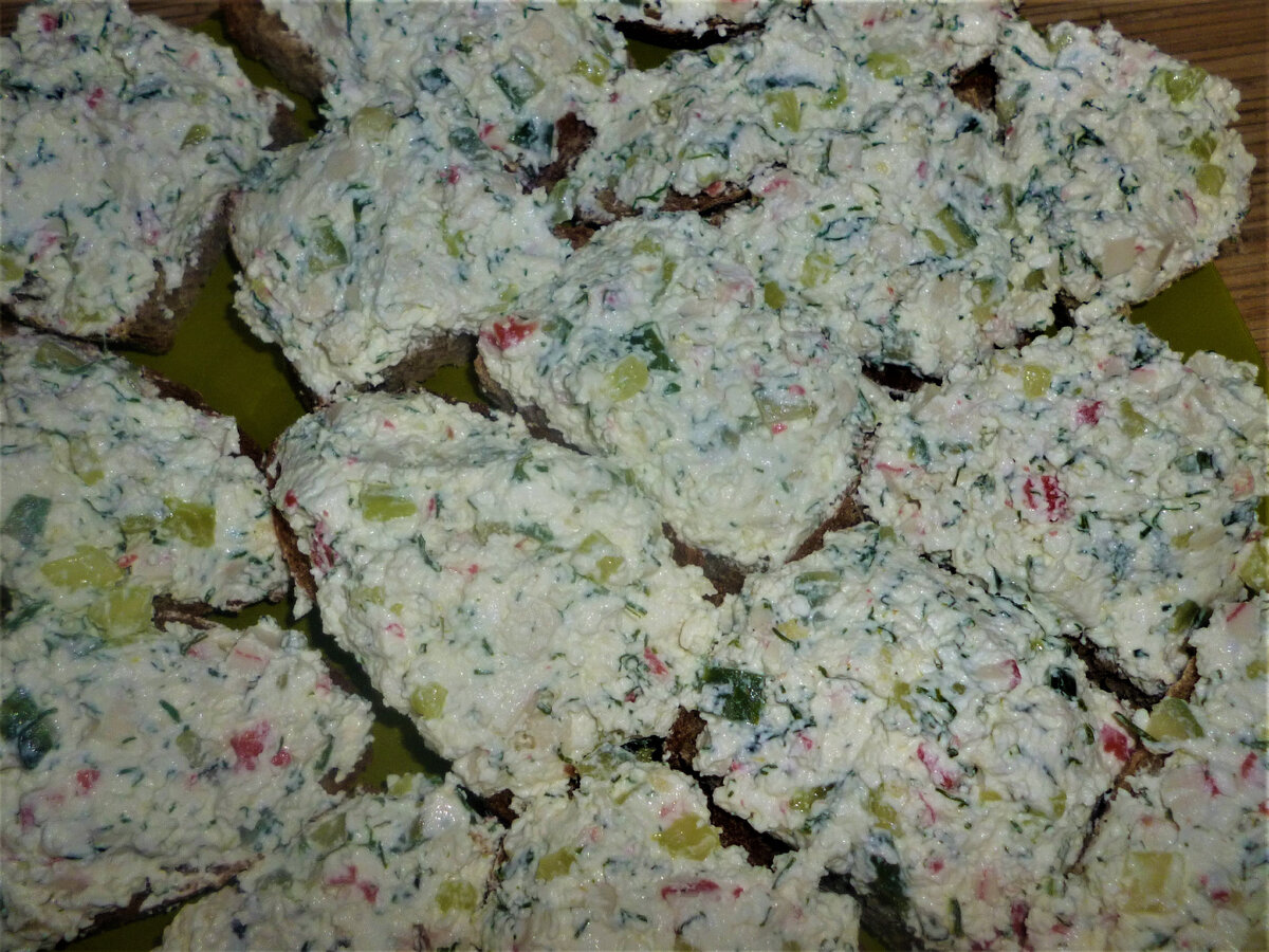 Очень люблю такие намазки из творога. Именно из творога, а не из сыра с майонезом. Хочется ведь накормить семью не только вкусной, но и полезной пищей. Вот творожные салаты-намазки как раз из таких блюд: очень вкусно, и при этом полезно. Вариантов существует множество. Я же предложу интересненький вариант с крабовыми палочками. Нам потребуется: Творог 200г Сметана 2-3 ст.л. Крабовые палочки 100г Небольшой свежий огурчик Укроп Чеснок 2 зубчика (когда не нужно ехать в общественном транспорте) Хлеб черный. Примечание. Зимой свежий огурец можно заменить маринованным. Вкус будет даже ярче. Приготовление: Творог растираем со щепоткой соли. Огурец и крабовые палочки нарезаем максимально мелко. Но на терке тереть не нужно: будет лишний сок. Смешиваем творог, огурец и палочки, добавляем укроп. Кладем сметану, прямо в нее выдавливаем чесночок. Перемешиваем. Готово! Нарезаем черный хлеб, а можно и белый. Намазываем бутерброды. Совет. Лично я люблю есть такой салат вообще без всякого хлеба, просто