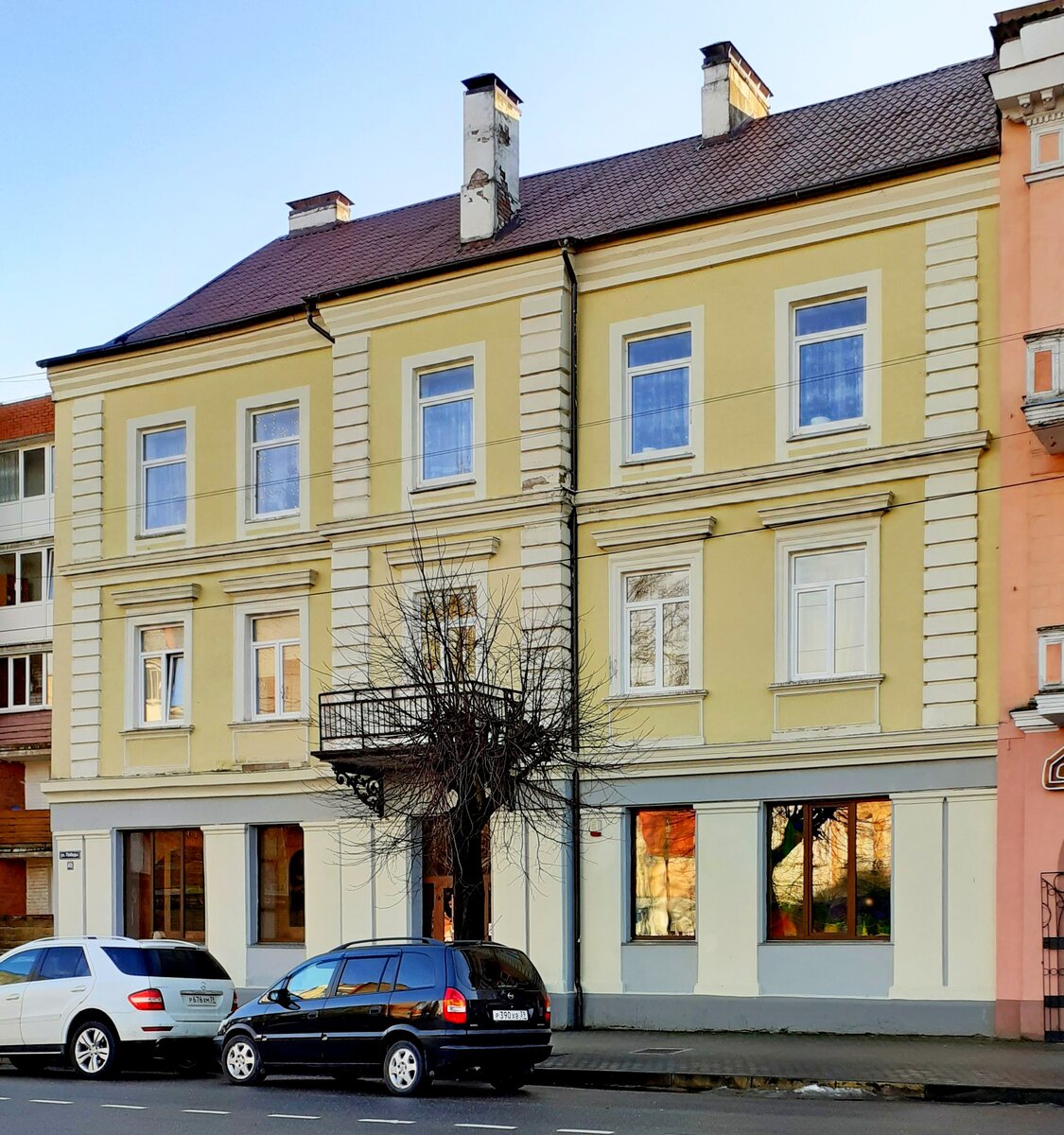 Внизу находится пиццерия, на двух верхних - квартиры. Вход в жилую часть - со двора.