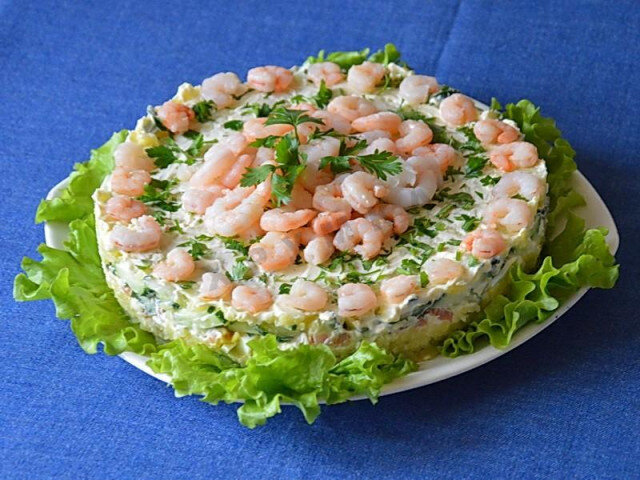 ингредиенты Красная рыба (малосольная семга или другая красная рыба) 200 гр Креветки 200 гр Яйца 3 шт Картошка 4 шт Огурцы (свежие) 2 шт Майонез 300 гр Соль по вкусу Салат-латук (или больше листов) 5 шт Зелень (любая, несколько веточек для украшения) по вкусу Подготавливаем продукты для салата. Отвариваем в мундирах картофель, яйца - вкрутую. Размораживаем креветки. Если это необходимо, - отвариваем их. Моем огурцы, зелень, салат, стряхиваем с них воду. Мелкими кубиками нарезаем красную рыбу. Нарезаем тонкой соломкой огурцы и яйца (или натираем яйца на тёрке). Натираем на крупной тёрке картофель. Креветки отбрасываем на дуршлаг, чтобы стекла вода. Выстилаем дно блюда листьями салата. Ставим форму в центр блюда и начинаем формировать салат, чередуя слои. Первым слоем выкладываем половину натёртого картофеля, смазываем майонезом, слегка присаливаем. Затем - яйца, майонез Потом - рыба, майонез. Затем - слой огурцов, майонез. В конце выкладываем оставшуюся картошку, покрываем майонезом, сл