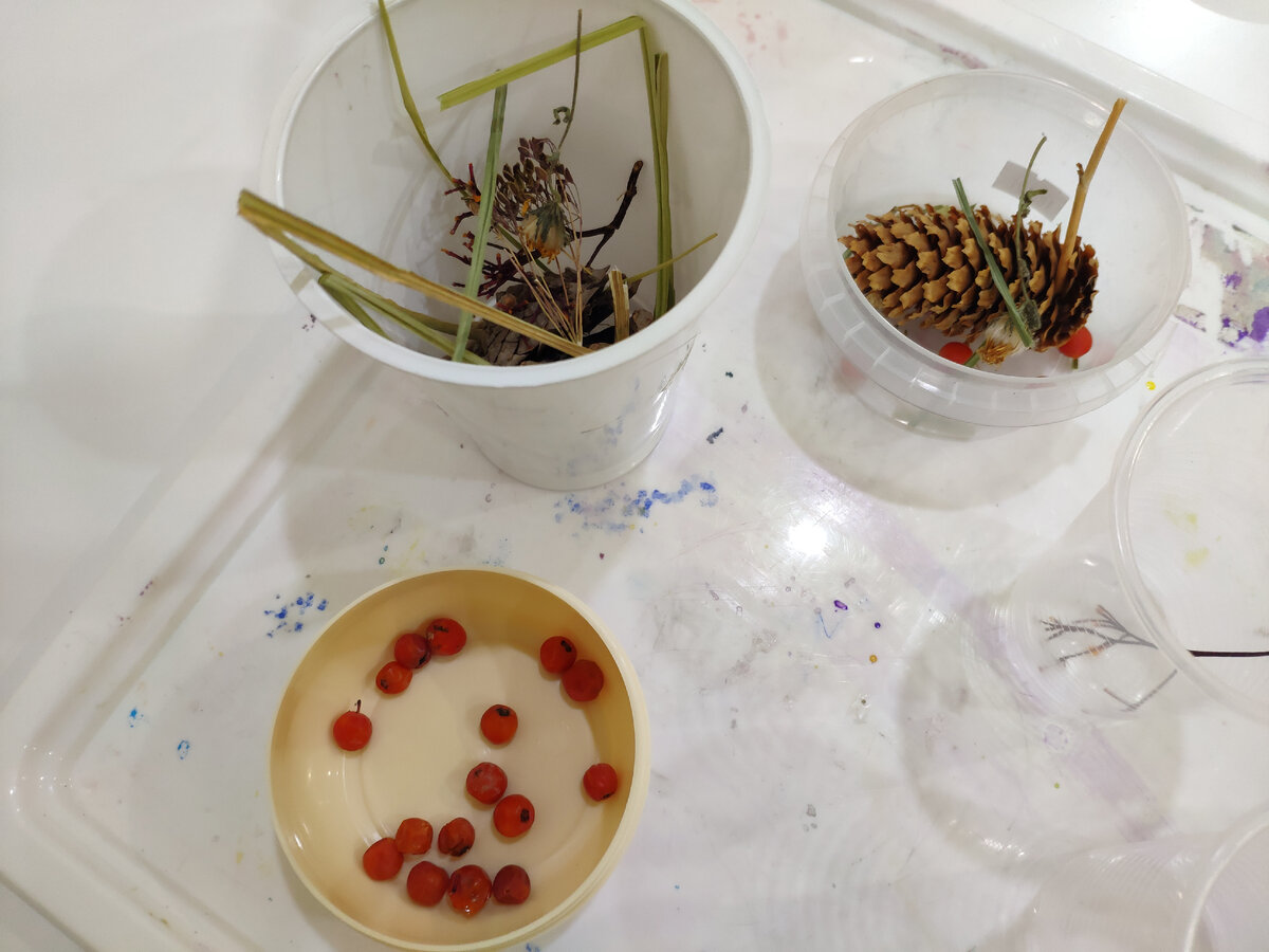Хит этого сезона - ёлочные игрушки изо льда. Давно хотела что-нибудь сделать изо льда. Например, в прошлом году воспитательница в детском садике сказала принести разрезанные коробки от молока. Они наливали туда воду, оставляли на улице, и у них получилось много ледяных кирпичей для крепости. В этом году во дворе поставили ёлку большую и красивую, но без игрушек. Ладно хоть гирлянды и мишуру повесили. И решили мы сделать дома в морозилке ледяные игрушки из природных материалов, чтобы даже если они растают, мы несильно намусорили. Вот подробная инструкция, как сделать елочную игрушку изо льда. 1. Подготовить заранее природный материал. Это могут быть веточки, рябина, шишки, ветки ёлок, какие-нибудь ягоды, семечки, засушенные (или живые!) цветочки. Хорошо смотрятся материалы красного цвета. Но можно обойтись и без всяких материалов, одной только краской. 2. Выкладываем природный материал в ёмкость. Я брала пластиковые стаканчики и баночки от сметаны, а также какие-то баночки от кремов. По