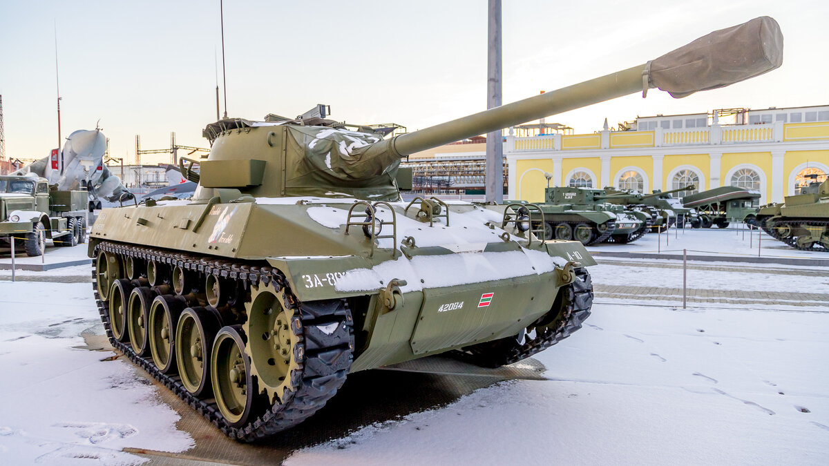Очередной экспонат музея военной техники УГМК в городе Верхняя Пышма. В 1941 году в США был объявлен конкурс на разработку танка для десанта, с возможностью его переброски самолетами и способного противостоять танкам противника. Конкурс выиграла фирма Marmon-Herrington с проектом танка Т9. После множества модернизаций со сменой подвески, заменой башни и установки различных орудий, возник танк Т49. На его базе разработана САУ Т67, которая была модернизирована до САУ Т70 и лишь в марте 1944 года принята на вооружение под индексом М18. 76-мм самоходная пушка M18 Hellcat обладала двумя важными преимуществами: высокая скорость и поворачиваемая башня, которые позволяли эффективно бороться с неповоротливыми танками противника. У самоходки открытая башня и легкая броня, но благодаря наклону бронелистов защита была удовлетворительной - при попадании снаряды часто рикошетировали. В кормовой части виден люк, за которым расположен двигатель закрепленный на полозьях. Для ремонта люк открывался и
