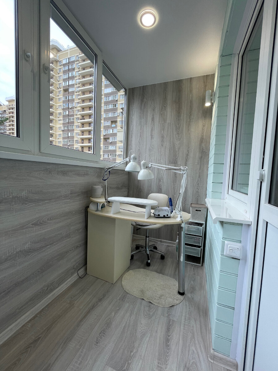 Многие жители многоквартирных домов не воспринимают балкон, как полноценную часть квартиры. Для них это некий архитектурный элемент, который выполняет подсобные функции — такое себе, безусловно, полезное но, намного менее ценимое пространство, чем собственно жилплощадь. Наверное, это действительно так. Однако стоит приложить совсем немного усилий, и балкон превратится в абсолютнофункциональное пространство, причем любого назначения. Из него легко можно сделать комнату. Еще одну. Настоящую. Со всеми полагающимися атрибутами — отоплением, освещением, электропроводкой, вентиляцией. Одна из наших заказчиц решила сделать из балкона маникюрный кабинет. Мы воплотили ее желание в реальность изящно, быстро, недорого. Дано: стандартный балкон типового многоэтажного дома. Задача: создать функциональное рабочее пространство для мастера маникюра. Небольшая площадь балкона, тем не менее, вполне позволяет создать функциональное и комфортное рабочее пространство. И это не голословное утверждение. Все