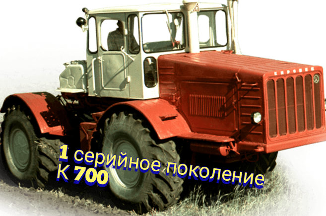 Первое поколение К-700 которые вышли в серийное производство в 1964 году, показало себя с наилучшей стороны. Для своего времени эта была просто великолепная машина. По инженерии и производительности «Кировец» превосходил всё что существовало на тот момент в СССР. Трактор состоял из двух половинок-полурам, шарнирно сочлененная рама, позволяла путём поворота полурам во круг вертикального шарнира изменять направление. То есть при поворотах водитель воздействовал не на колёса, а на соединительный механизм, путём того что секции складываются и обеспечивалась отличная маневренность, а поворот во круг горизонтального шарнира позволял копировать местность, привод естественно полный. На передней раме закреплён силовой агрегат, постоянно ведущий мост, топливный резервуар и двухместная кабина. Задняя рама несёт отключаемый мост, а так же навесное оборудование. Двигатель использовался четырёхтактный 8-целиндровый V - образный ЯМЗ-238МБ мощность 200 л. с. «Кировец» оценили и на мировой сцене в 196