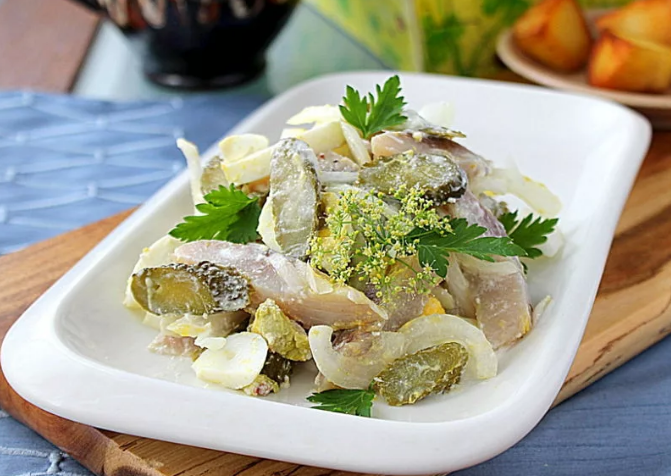 На селедочницу уложить рубленую массу, придав ей форм; рыбки, посыпать рубленым яйцом и зеленью петрушки. Можно также обложить сельдь ломтиками очищенных яблок, огурцов красного редиса, помидоров.