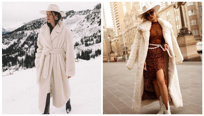 Белоснежные шубы из эко меха входят в топ самых актуальных вещей зимы 2022. Это верхняя одежда фантастически освежает внешность, делает образ максимально выразительным и стильным. Сегодня стилисты поделятся с нами эффектными аутфитам с белой шубой, которые с легкостью повторит каждая из вас. Первый образ - это максимально эффектный и стильный монохром, неотъемлемой деталью которого является оверсайз белая эко шуба. Трендовую верхнюю одежду стилисты дополнили свитером с высокой горловиной, белыми джинсами, меховой сумкой "облако", а также трендовыми остроносыми сапогами на каблуке "рюмочка". Отличным завершением этого лука являются ретро солнцезащитные очки с белой оправой. Дерзкий и современный аутфит получился благодаря белой шубе, анималистичному платью с эффектным разрезом, шляпе с широким полями, контрастному ремню и остроносым ботильонам в ковбойском стиле. Белая эко шуба + миди светлое трикотажное платье + эффектные ботильоны на шнуровке, трендового сливочного цвета + базовая кар