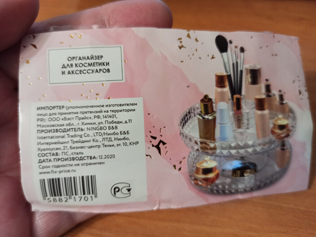 Все началось с похода в магазин за жидким мылом и салфетками. Обычно покупаю в Фикс Прайс. Как всегда не удалось сдержаться: накупила вкусняшек к чаю (чак-чак, вафли). Углядела необычный круглый и поворотный органайзер для косметики. Поняла, что мне срочно нужно привести в порядок косметику. Пришла домой, стала собирать. Прибор состоит из 3 частей. Кстати, органайзер хоть и был упакован в пленку, но несколько штук в магазине были с трещинами. Если решите покупать, выбирайте тщательно! Диаметр 23 см. Высота 18 см. Стоит 249 руб. Состав: сталь, ПС (полистирол). Собирается легко за секунды. Получается 2-х ярусный органайзер, который имеет поворотный механизм. Вращается нижний и верхний ярус одновременно. На дне 5 маленьких подшипников. Нижний ярус без отделов, а верхний с 9 отсеками. Вот так он выглядит в собранном виде: Загрузила косметику, но потом передумала. Посмотрела на свой заставленный кухонный стол. Решила органайзер перенести на кухню. Поставила сверху солонку, перечницу. Уб