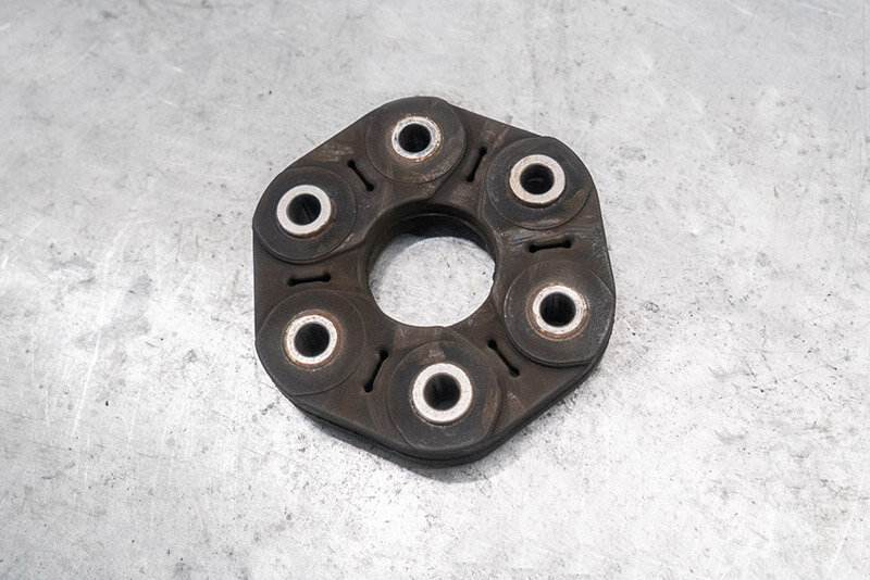 Наши специалисты выполнили ряд диагностических процедур, в ходе которых был обнаружен износ эластичной муфты заднего карданного вала. После согласования работ мы выполнили демонтаж старой муфты кардана. Материал, из которого изготовлена муфта, потерял упругость и втулки муфты начали разбалтываться под воздействием крутильных колебаний. Вследствие износа муфта перестает выполнять свои основные функции по снижению динамических нагрузок и возникают вибрации. В качестве замены использовалась новая оригинальная муфта кардана. При сборке важно правильно установить все элементы, чтобы не нарушить их функциональность. В процессе установки муфты применяются новые болты крепления, которые закручиваются с определенным усили