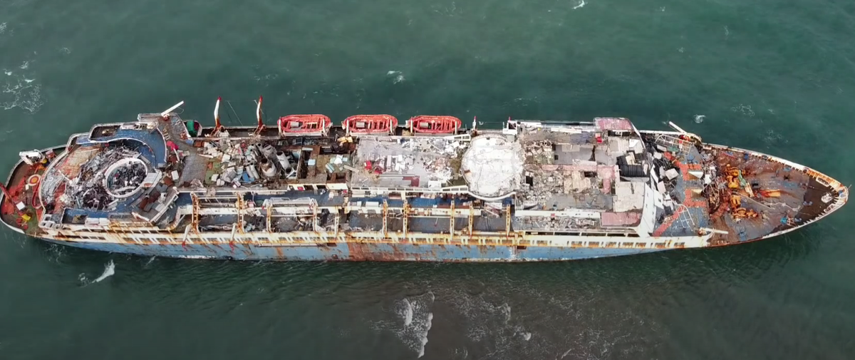 Это судно называется Enchanted Capri, что переводится как Очарованные Капри. Раньше оно было круизным лайнером класса "Белоруссия", которое было построено в 1975 году на судостроительных верфях в Финляндии по заказу Советского Союза. И сейчас оно находится у берегов Мексики в заброшенном состоянии. Судно много раз меняло владельцев после распада СССР, и здесь оно оказалось, потому что попало в шторм. Как можно видеть на фото с дрона выше, судно переломлено. Есть довольно большой перекос по обоим бортам с явно выраженным местом перелома. Хотя в лучшие свои годы круизный лайнер выглядел весьма неплохо: Вы наверное уже заметили, что воды залива сейчас спокойные, как таковых волн нет. Но судно издаёт угрожающий скрежет. Видимо в месте излома металлические части задевают друг об друга. И поэтому экскурсия ограничилась только лишь пролётом дрона. Нас на борту не было. Фактический владелец даже не пытается разобрать бывший круизный лайнер на металлолом, потому что этот процесс не окупится.