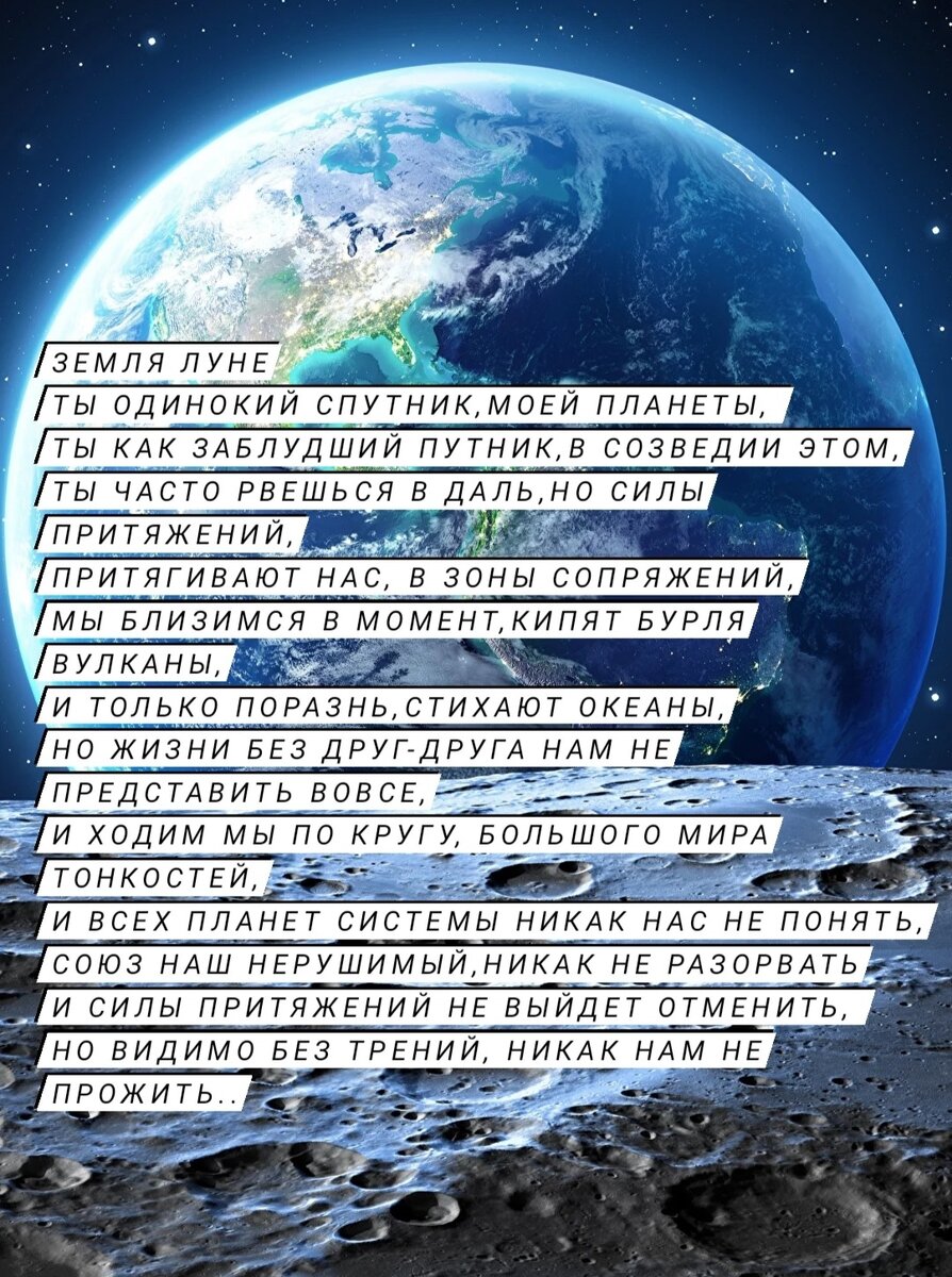 Ты одинокий спутник,моей планеты, Ты как заблудший путник,в созвездии этом, Ты часто рвешься в даль,но силы притяжений, Притягивают нас,в зоны сопряжений, Мы близимся в момент,кипят бурля вулканы, И только поразнь,стихают океаны, Но жизни друг без друга нам не представить вовсе, Вращаемся по кругу,большой вселенной тонкостей, И всех планет системе,никак нас не понять, Союз наш нерушимый никак не разорвать, И силы притяжений,не выйдет отменить, Но видимо без трений,никак нам не прожить. #стихи о жизни #любовь #космос #литературное творчество #поэзия