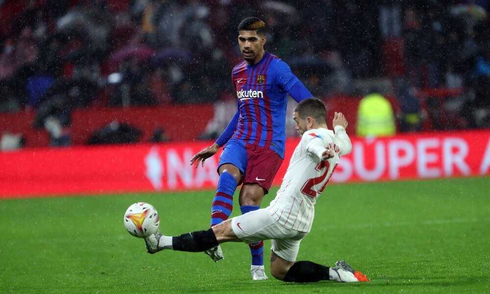 Конечно же, гости старались строить треугольники на флангах, в основном слева. Работы у Кунде было немало, и в первом тайме он реже подключался к атакам, чем Рекик, что отчасти удивительно, учитывая его пасовые характеристики. Но отчасти севильцы пожертвовали этим умением защитника, которому приходилось в первую очередь сдерживать Альбу, Абде или Гави.