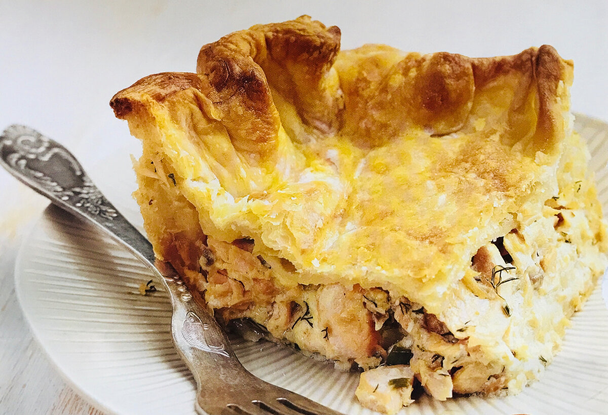 Пироги - унивесальное блюдо для перекуса, полноценного завтрака и ужина, а также, для праздничного стола. Приготовим вкуснейший пирог из семги. Нам понадобятся 500 грамм готового слоеного бездрожжевого теста, 500-600 грамм филе семги или лосося, одна луковица, пара зубчиков чеснока, по полпучка зеленого лука и укропа, растительное масло, 100 мл 20% сливок, 100 грамм сыра гауда, сок половины лимона, соль и перец по вкусу, одно яйцо и столовая ложка молока для льезона. Приготовим начинку. Филе нарежем небольшими кусочками. Лук и чеснок очистим и мелко нарежем. Зеленый лук и укроп хорошо промоем и мелко нарубим. На сковороде разогреем масло и обжарим кусочки семги до готовности. Переложим рыбу в тарелку. В оставшемся масле обжарим лук, затем добавим чеснок и вернем в сковороду рыбу. Приправим солью и перцем, и хорошо перемешаем. Вольем сливки и немного выпарим. Добавим лимонный сок и опять хорошо перемешаем. Когда начинка остынет, добавим в нее измельченную зелень и натертый сыр. Тесто