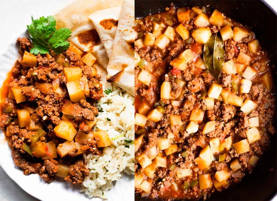 - Разогрейте большую сковороду на среднем огне, добавьте говяжий фарш. Готовьте, пока мясо не подрумянится. Слейте жир и верните на огонь.