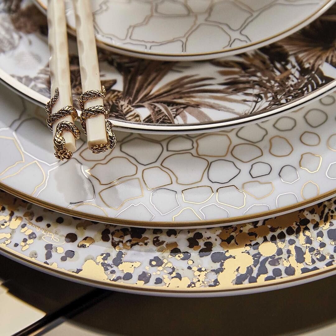 В новогоднюю ночь главное создать праздничную атмосферу, которая должна сохраняться в каждой детали. Праздничный стол, ломящийся от яств, – не исключение. Важно продумать не только новогоднее меню и сервировку, но и обратить внимание на, казалось бы, самое малозначительное. Кольца для салфеток Салфетки – must-have праздничного стола, но стоит продумать и их эффектное оформление. Обратите внимание на эффектные металлические кольца для салфеток, которые идеально сочетаются и с серебряными, и с золотыми столовыми приборами. В коллекции Roberto Cavalli Home Interiors есть выразительное кольцо Cobra из стали с покрытием сусальным золотом и эмалью, инкрустацией из натуральных камней. Интересно выглядит стальное кольцо для салфеток Corallo с инкрустацией в виде коралла из эмали. Особенно, этот декоративный элемент будет уместен в паре с блюдами из серии Rose Jewel. Добавьте немного морского бриза в новогодний декор! Более сдержанно и не менее торжественно смотрятся кольца для салфеток с инкру