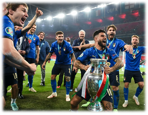 Италия в этом году переродилась заново. Однако никто не ставил на победу "скуадра адзурры" на ЕВРО. Многие утверждали, что полуфинал это потолок, однако Манчини и вся его банда сказали всему миру "НЕТ, НЕ ПОТОЛОК". На групповом этапе итальянцы вообще никого не заметили. В 1/8 прошли австрийцев, далее бельгийцев и испанцев. И вот он суперфинал против Англии. Сборная "трех львов" играла у себя дома при переполненном стадионе. Подопечные Саутгейта забили в самом начале и казалось, что тогда точно не день итальянцев. Однако гол Бонуччи на 67-ой минуте отсрочил развязку финала до серии пенальти. Для англичан это мог быть великий день. Ранее они никогда не выигрывали ЕВРО. Такого напряжения в финале чемпионата Европы не было уже давно.
