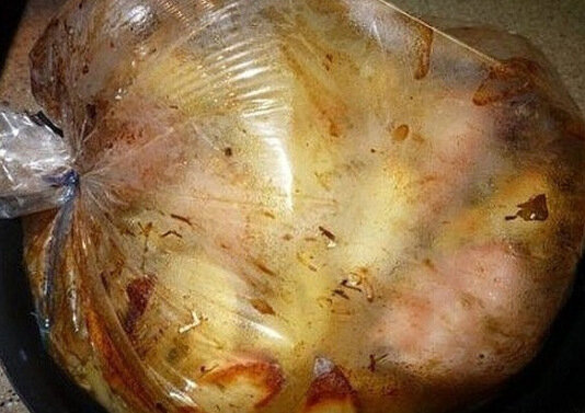 Готовится очень просто, и подготовка продуктов занимает минимум времени. Мясо, приготовленное по этому рецепту, получается очень мягким и сочным, а картофель - ароматным. Ингредиенты: -400-500 гр. мяса (у меня свиная шейка) -картофель 6-8 средних шт. -шампиньоны (количество на ваше усмотрение) -1 помидор -1 болгарский перчик (можете добавить фасоль, цветную капусту, на ваш вкус). -1 большая луковица (репчатый) -4-5 зубчиков чеснока -соевый соус 3 ст.л. -ваши любимые травы ( у меня орегано, тимьян, укроп, можно свежие, можно в сухом виде.) -смесь "Итальянские травы" -смесь перцев "Мельница" -соль -"рукав" для запекания Приготовление: 1. Мясо моем, обсушиваем бумажным полотенцем. Шампиньоны помыть и разрезать на 2 части. Режем мясо на кусочки (примерно 3*3см). Лук мелко шинкуем или режем кольцами, полукольцами, как угодно. Режем чеснок зелень (если свежая), томаты, перец или другие овощи. 2. Выкладываем мясо в глубокую посуду. Добавляем к нему всё, что перечислено в р