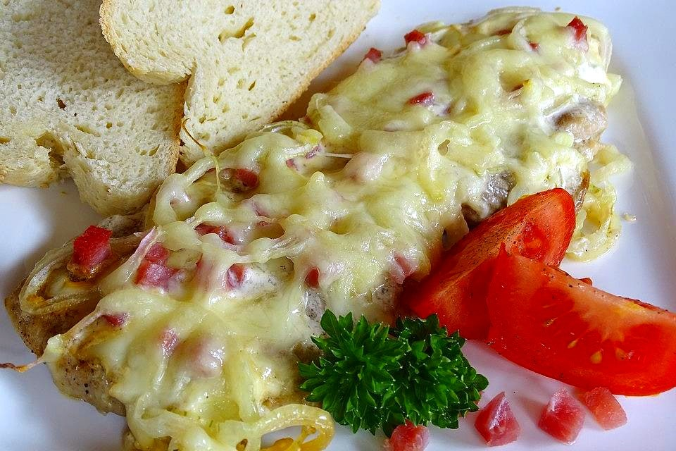 Венский шницель знают все. А мне подкинули шницель эльзасский. Не скажу, что это плохо, вполне вкусно, особенно если вы любите свинину. А еще — что-то мне этот шницель мучительно напоминает. Этакие отголоски «мяса по-французски» в нем прослеживают, так что возникает вполне логичный вопрос, имеет ли этот эльзасский шницель хоть какое-то отношение к Эльзасу и близлежащим областям, или нет? Впрочем, какая разница. Главное — вкус. Берем: Как готовим: Свинину нарезаем. Толщина шницеля — 5-8 миллиметров, ширина и длинна — как можно больше. Слегка отбиваем. Натираем солью, перцем и мускатным орехом. Лук нарезаем полукольцами, сыр — трем, ветчину нарезаем кубиками. Шницели обжариваем на сковороде до румяной корочки, укладываем в форму для запекания, смазываем сметаной. Сверху на сметану выкладываем лук (полукольцами), кубики ветчины и посыпаем сыром. Отправляем в духовку при 200 градусах на 15 (примерно) минут. Приятного аппетита!