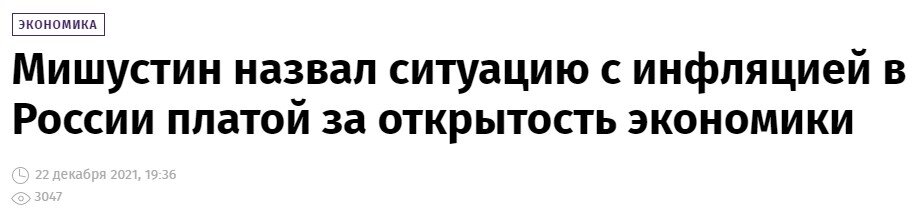 Премьер-министр РФ Михаил Мишустин на встрече с членами экспертного совета при правительстве заявил, что ситуация с ростом инфляции в России - это "плата за открытость экономики". Он отметил, что российская инфляция является преимущественно импортированной, и как это происходит в последнее время, обвинил во всем западные страны, "нарушающие макроэкономические параметры". Давайте разберем это высказывание. Начнем с того, что российская экономика не является уж столь открытой, в сравнении с теми же западными странами. В ее отношении действует большое количество ограничений (санкций) как прямого, так и обратного характера. То есть, с "открытостью экономики" в последнее время ситуация, мягко говоря, не очень, в том числе и благодаря "ответным" санкциям, которые как раз влияют на инфляцию сильнее, чем прямые. Ведь когда России запрещают что-то экспортировать за рубеж, это, наоборот, защищает ее от роста цен (за рубежом они выше). А когда Россия запрещает импорт каких-то товаров - это подним