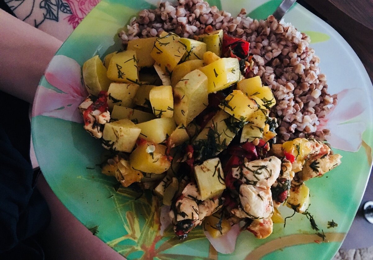 Представляю вашему вниманию легкое и вкусное блюдо Нам понадобятся: 1 курица 2 помидоры(один или больше) 3 кабачок 1 4 кубик куриный (специи по вкусу) 5 зелень (Куриную грудку я поделил на 5 частей и хватит мне на несколько раз) Приготовление: Курицу,кабачок,помидоры закидываем на сковороду, тушим, добавляем по вкусу специи и если есть зелень.Всё проще не куда. К этому всему можно отварить немного гречки/рису и будет вам счастье Спасибо за внимание, всем приятного и до встречи)