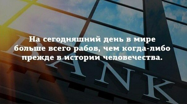В школе нам внушают, что раб - это тот, кого гонят кнутом на работу, плохо кормят и в любой момент могут убить. В современном мире рабом является тот, кто и не подозревает, что он, его родные и все окружающие его люди являются рабами. Тот, кому и в голову не приходит, что, по сути, он полностью бесправен. Что его хозяева с помощью специально созданных законов, силовых структур, коммунальных услуг и, прежде всего, с помощью денег могут заставить его сделать всё, что им от него потребуется. Современное рабство - это не рабство прошлого. Оно другое. И строится оно не на силовом принуждении, а на изменении сознания. Когда из гордого и свободного человека под воздействием определённых технологий, посредством влияния идеологии, власти денег, страха и циничной лжи получается психически неполноценный, легко управляемый, продажный чeловeк. Что собой предстaвляют мегапoлисы планеты? Их можно сравнить с гигантскими концлагерями, населенными психически сломленными, абсолютно бесправными жителями.