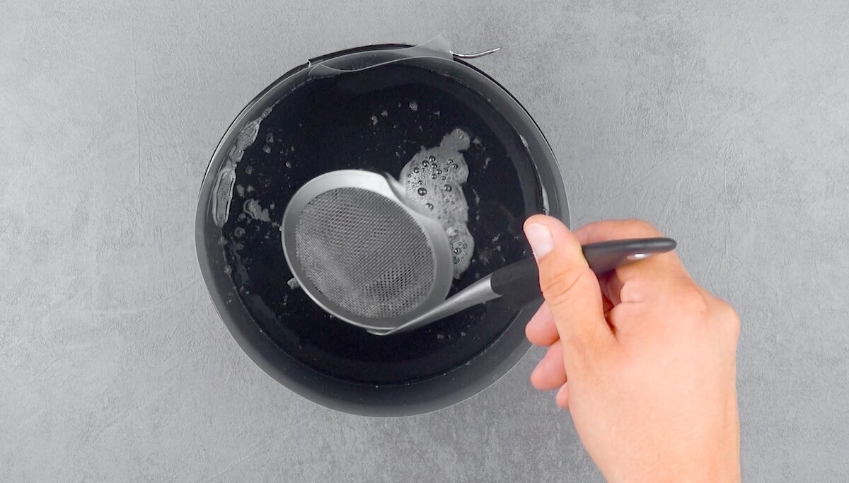 Уровень сложности: продвинутый Чтобы приготовить "Летающий торт" в желе, нам нужно: Для приготовления бисквита: Для желе: Для масляного крема: Для работы и декора: Готовим поразительный "Летающий торт": 1. Чтобы приготовить желе для торта, смешиваем воду, желатин, сахар и лимонный сок в кастрюльке и нагреваем постепенно примерно до 70 °C. Если на поверхности появится пена, аккуратно убираем ее. Когда смесь станет однородной, остужаем ее примерно до 30 °C. Позже, если желе слишком загустеет, его всегда можно нагреть, чтобы оно снова стало жидким. 2. Вставляем ацетатную пленку в форму для торта и ставим в холодильник, чтобы форма остыла. В холодную форму наливаем половник смеси для желе и ставим