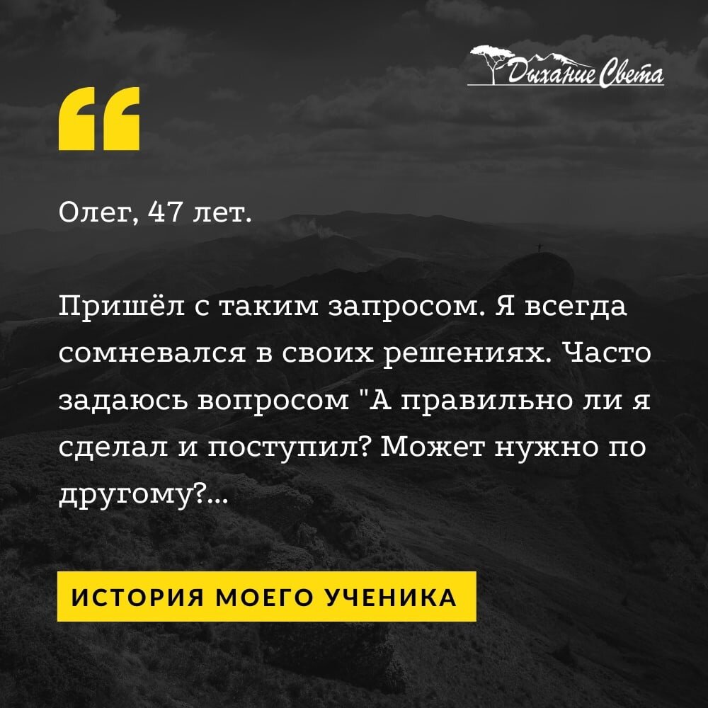 Олег, 47 лет. Пришёл с таким запросом. Я всегда сомневался в своих решениях при любой ситуации. Что бы я не делал и не совершал, даже самое незначительное, я всегда осматриваюсь назад и задаюсь вопросом "А правильно ли я сделал и поступил? Может нужно по другому? И при этом внутренне чувствую, как будто я отчитываюсь и ищу одобрения или признания!