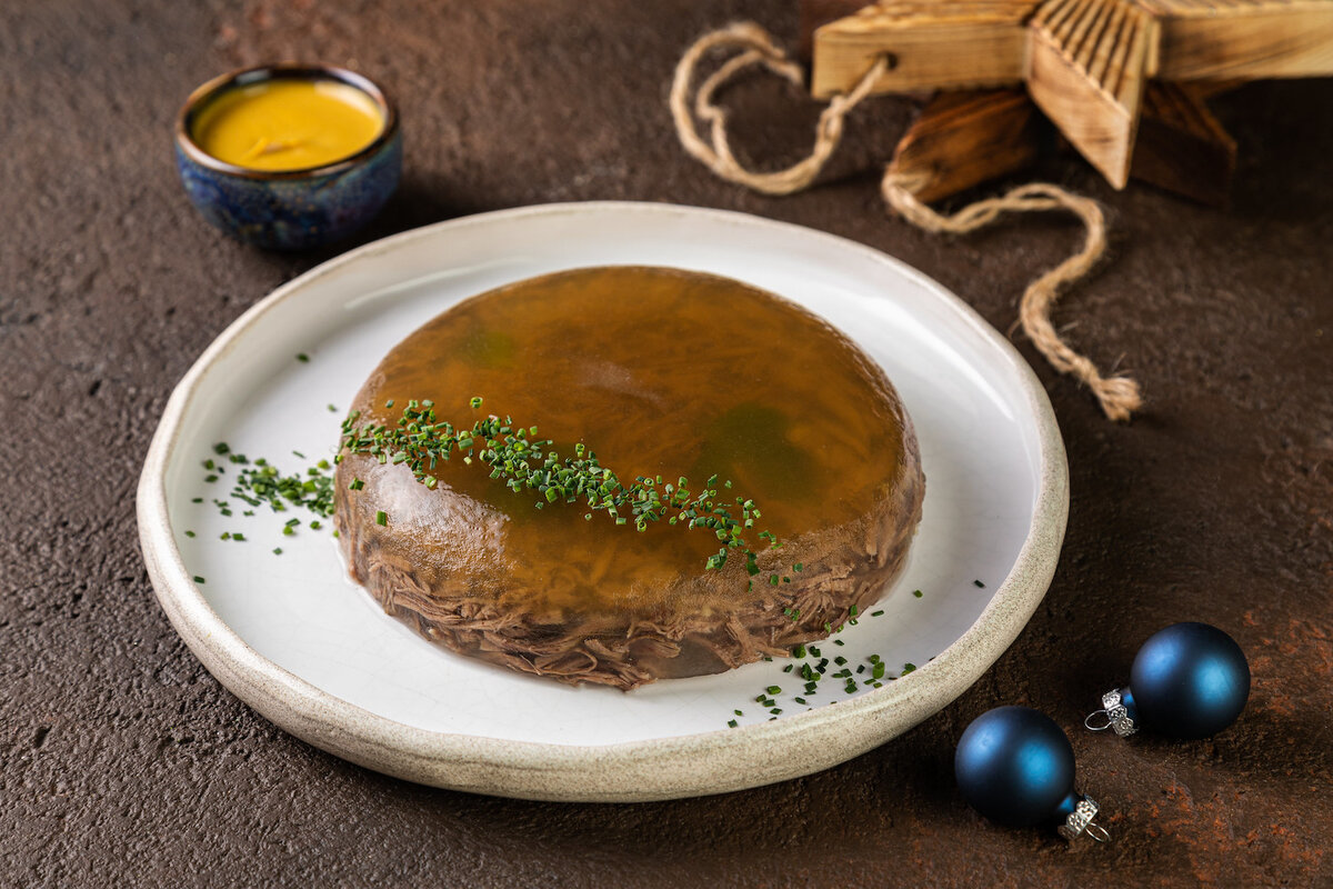- Нарезаем мясо. Выкладываем в формы. Добавляем чеснок и заливаем бульоном. Отправляем в холодильник на ночь.