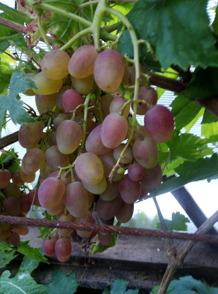Кишмиши любят все, в том числе и я, поэтому и посадил данный сорт. Как я раньше говорил, сначала посадил в парник. Многие не знают даже какую почву любит виноград. Многие пичкают почву навозом, чего на мой взгляд делать нужно очень осторожно. Однажды о составе почвы я узнал от французского виноградаря и всегда теперь делаю также. В состав входят три равные части. 1-крупнозернистый песок. 2-глина. 3-мелкий щебень. Это обязательный состав для меня. но я ещё добавляю перегной. Теперь о находке. Это один из самых ранних сортов. Гроздь завязывается уже на следующий год после высадки укорененного черенка. Укоренение приближается к 100%, так что с этим проблем нет. Болезней не наблюдал, но для профилактики один раз обработал купролюксом и всё. Весной вношу суперфосфат и мочевину. Далее во время вегетации один раз в две недели препарат здравень винограда. В середине августа Находка созревает. Для кишмиша ягода очень крупная, правда в наиболее крупных ягодах встречается косточка, но это не крит