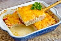 Запеканка с куриным фаршем, помидорами и сыром 4 порции Примерно 1 час (ваши 15-20 мин) Интересная идея для обеда или ужина - запеканка из диетического куриного фарша с луком, помидорами и сыром. Запеканка нежная, благодаря толстому слою куриного фарша она сытная и питательная, слои лука и помидоров делают её сочной, а корочка из расплавленного сыра - очень аппетитной. Продукты (на 4 порции) Подготовьте необходимые ингредиенты. Включите духовку разогреваться до 180 градусов. Куриный фарш переложите в миску. Посолите и посыпьте приправой хмели-сунели. Хорошо перемешайте куриный фарш. Форму для запекания смажьте подсолнечным маслом (размер моей формы 16х18х4,5 см). Выложите в подготовленную форму куриный фарш и распределите его ровным слоем. Лук очистите и нарежьте тонкими полукольцами. Выложите лук куриный фарш фарша. Помидоры промойте и нарежьте кружочками. Если используете крупный помидор, нарежьте его полукружиями. Покройте кружочками помидоров слой из лука. В майонез выдавите ч