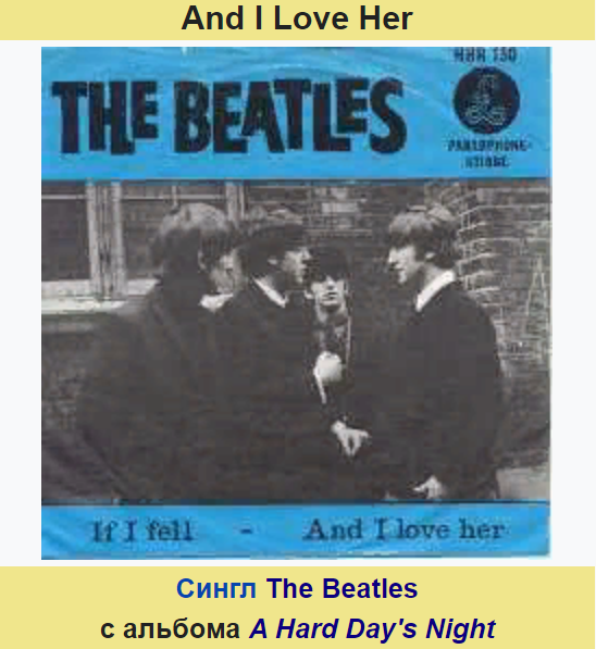 "And I Love Her", что в переводе значит "И я люблю её" - это первая баллада, записанная и исполненная группой. Песня довольно известная. Песня была написана Полом Маккартни при участии Джона Леннона. Одна из первых романтических баллад Полаю У Пола в песне и ведущий вокал. При записи был сделан 21 дубль! Музыканты работали долго, пока не нашли оптимальный вариант звучания. 10 июля 1964 года песня вышла в Великобритании, а 20 июля в США. Пол написал песню для своей подруги - актрисе Jane Asher. Джон Леннон называл эту песню - "Первой "Yesterday" Пола". Песня была написана в доме, принадлежащим родителям Jane Asher. При записи этой песни Джон и Джордж играют на акустических гитарах. Джордж еще играет на клавикордах, а Ринго - на барабанах "бонго".