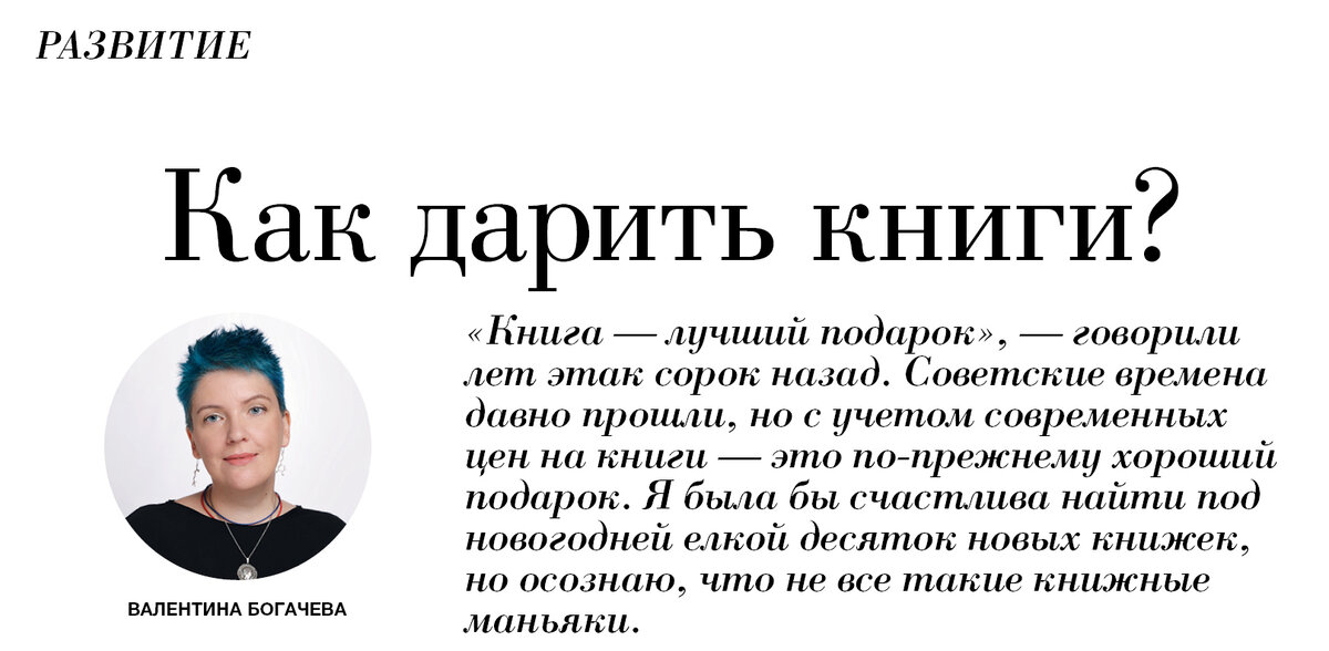 Декабрь к концу идет, а я не поделилась колонкой! В декабрьском номере "Дорогое удовольствие Томск" КАК ДАРИТЬ КНИГИ? «Книга – лучший подарок», — говорили лет этак сорок назад. Советские времена давно прошли, но с учетом современных цен на книги – это по-прежнему хороший и ценный подарок. Я была бы счастлива найти под новогодней ёлкой десяток новых книжек, но осознаю, что не все такие книжные маньяки. Тем не менее уверена, книгу в подарок можно подобрать каждому человеку. Я люблю дарить книги и получать их в подарок. Имея и в том, и в другом деле немалый опыт, сформулировала 5 идей, как подарить книгу, которая точно заинтересует человека. 1. На пике славы Всегда есть несколько книг, которые обсуждают не только в узких читательских кругах, но и на широких площадках - ожидаемые издания, победители премий, книги на острые дискуссионные темы, недавно экранизированные истории. Выбирая книгу, которая у всех на слуху нельзя быть уверенным, что она понравится человеку, но она гарантированно пр
