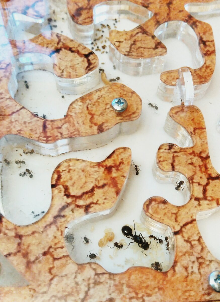 В Новый год приходит Дед Мороз. А к тому, кто себя хорошо вёл, он приходит заранее, на пару недель раньше и с подарками. Вот так и появилась у младшего сына муравьиная ферма. Опыта ухода за муравьями у нас ещё нет. Как говорится, я не волшебник, я ещё только учусь. А наблюдать за ними оказалось очень интересно. Итак, идём в гости к муравьям. Прибыли они в пробирке. Там были муравьи рабочие, пара солдат (они крупнее по размеру) и муравьиная матка (она больше муравья раза в три), которой сын дал красивое имя Алиса. Потом дня два они переселялись на новое место жительства-ферму. Сначала как все новосёлы ходили смотреть новое жильё. По одному и группами. Далее была приглашена Алиса, которая пройдя и осмотрев всю ферму, дала добро на переселение. Великое переселение происходило ночью. Под покровом темноты перенесли всё. Утром старое жилье было пусто и чисто. А в новом кипела работа. Обустраивались кладовые для запаса еды и детская комната. Кладовых получилось две. Детская комната