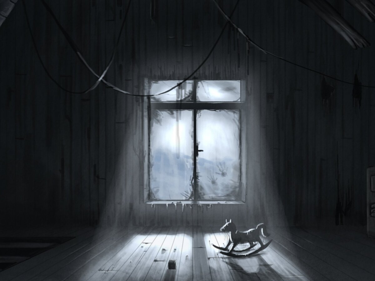 Детализированная картинка изображает слегка приоткрытую дверь и темный, призрачный мир по другую ее сторону.