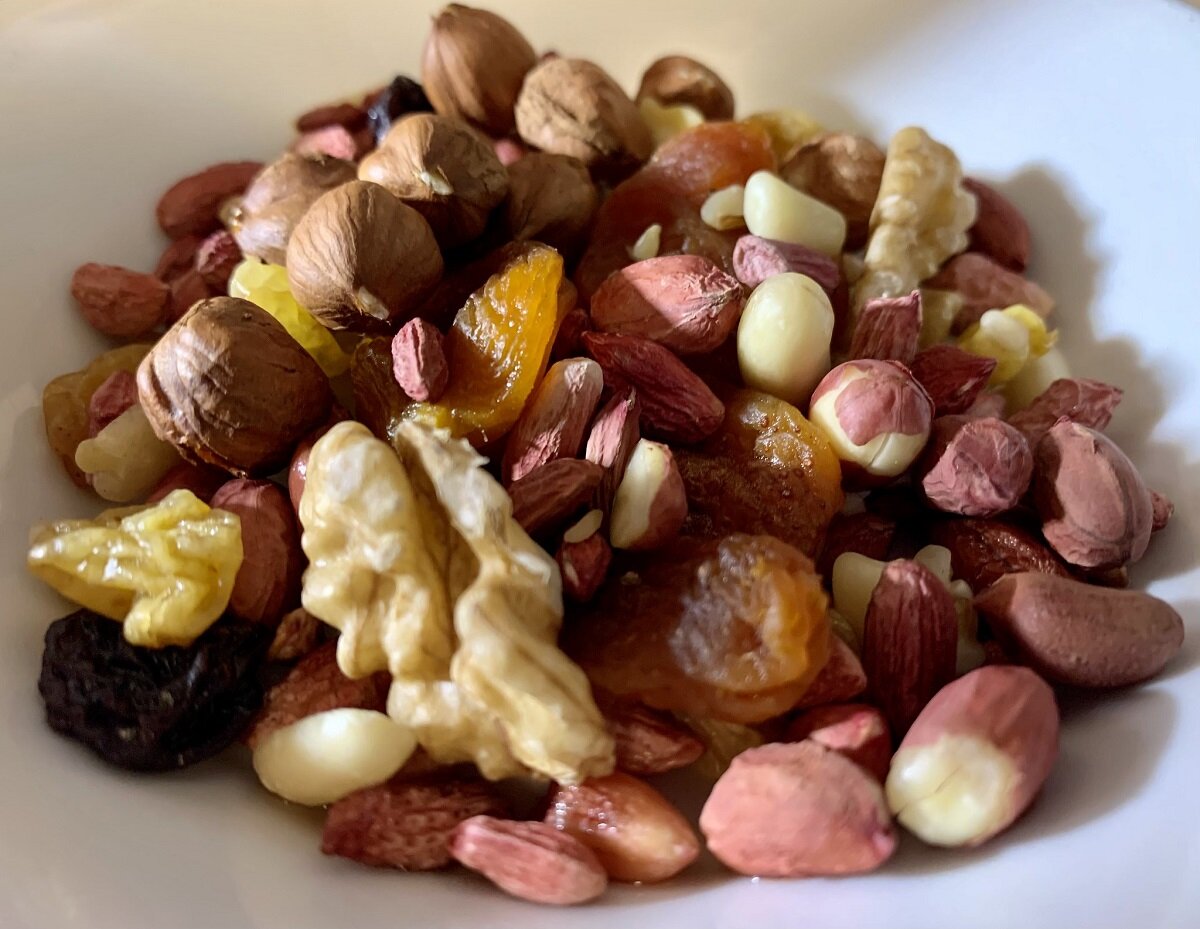 #Рецепт_ореховой_смеси имеет множество вариантов. Предлагаю Вам самый вкусный из них! О содержании витамин в ореховых смесях ходят легенды. Но не стоит переусердствовать в употреблении их! Ведь они обладают высокой калорийностью. Но спорить с их витаминными свойствами смысла не вижу. Итак, лучший (на мой взгляд) рецепт смеси! Нам понадобится: · грецкий орех – 200 гр. · темный шоколад – 100 гр. · кешью – 50 гр. · фундук – 50 гр. · тыквенные семечки – 50 гр. · курага – 30 гр. · мед – 2 ст.л. · растительное масло – 2 ст.л. · корица – 1 ч.л. · морская соль – 1 щепотка · герметичная стеклянная банка – 1 шт. Приготовление: 1. разогрейте глубокую сковороду с растительным маслом. Всыпьте на нее тыквенные семечки, орехи, соль, мед и корицу 2. обжаривайте на медленном огне 20 – 25 мин. пока орехи и семечки не подрумянятся 3. застелите стол пергаментом, распределите на нем орехи тонким слоем и подсушите около часа 4. поломайте шоколад на небольшие кусочки, переложите в миску и перемешайте с орехо