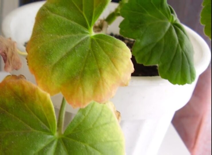 Пожелтение и засыхание листьев у герани зачастую связано с недоливом растения или чрезмерным его поливом – из-за чего корни начинают гнить, и в итоге растение погибает. Ещё одна причина пожелтения зачастую связана с нехваткой питательных веществ из-за того, что горшок стал слишком мал или из-за того, что растение долгое время не подкармливали. Что касается полива, то лучше не долить, чем перелить. При поливе растения следует ориентироваться на его состояние и на его фазу роста. Растение, которое растет, набирает бутоны и которое цветёт нужно больше влаги, чем тому, которое находится в периоде покоя. Также, следует ориентироваться на влажность грунта в горшке. Герань следует поливать после того, как верхний слой почвы на глубину около 1 см полностью высыхает. То, что герани стало тесно в можно определить перевернув горшок и обратить внимание на дренажное отверстие – если из них выглядывают корни, значит растение пора пересаживать. Что касается подкормки... Если растение долго