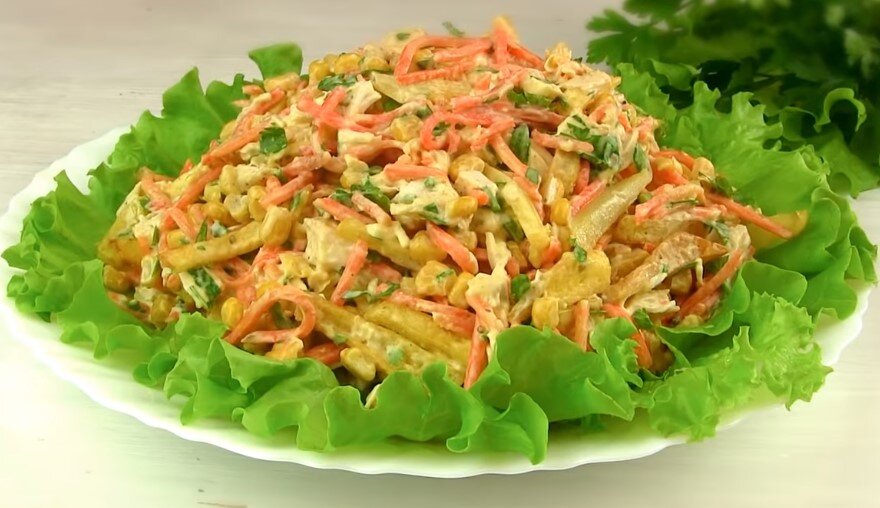 Представляем Вам очень простой и вкусный салат. Он еще и достаточно сытный, так как жареный картофель один из основных ингредиентов. Если на приготовление к празднованию остается очень мало времени, то этот салат идеально Вам подойдет. Нам понадобится: Шаг 1. Куриное филе кладем на фольгу, поливаем немного растительным маслом. Затем присыпаем черным молотым перцем с двух сторон по вкусу. Сверху кружочек лимона и заворачиваем филе в фольгу. Затем отправляем в духовку готовиться до готовности. Если хотите, то можно грудку отварить или обжарить целиком на сковороде. Но больше всего понравилось в духовке. Шаг 2. Пока грудка готовится, можно жарить картофель. Нарезаем его соломкой и обжариваем на разогретой сковороде с маслом, как картофель фри. Обжаривать лучше небольшими порциями, чтобы получить яркий цвет и не слипалась картошка. Обязательно после жарки выложить на салфетки или бумажное полотенце, чтобы убрать лишнее масол. Шаг 3. Остудили мясо и картофель — тогда продолжаем сборку салат