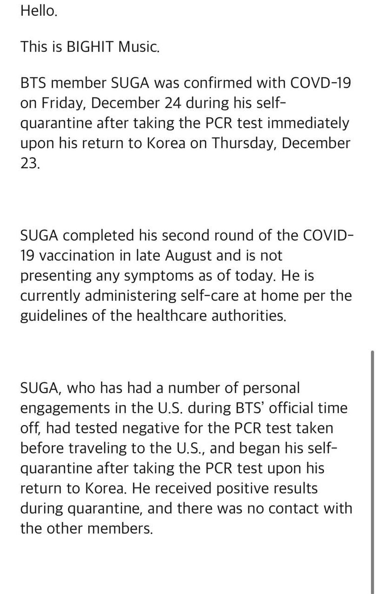 Не буду тянуть и перейду сразу к делу. Вот официально заявление от БигХит: Здравствуйте. Это компания BIGHIT Music. У участника BTS SUGA подтвердился COVD-19 в пятницу, 24 декабря, во время его самокарантина после сдачи анализа ПЦР сразу после возвращения в Корею в четверг, 23 декабря. SUGA прошел второй цикл вакцинации против COVID-19 в конце августа, и на сегодняшний день у него нет никаких симптомов. В настоящее время он занимается самолечением дома в соответствии с рекомендациями органов здравоохранения. SUGA, у которого было несколько личных встреч в США во время официального отпуска BTS, получил отрицательный результат ПЦР-теста перед поездкой в США и начал самокарантин после сдачи ПЦР-теста по возвращении в Корею. Во время карантина он получил положительный результат, и контакта с другими членами группы не было. Компания считает здоровье артистов своим главным приоритетом, и мы сделаем все возможное, чтобы помочь SUGA в его скорейшем выздоровлении. Мы также будем старательно вып