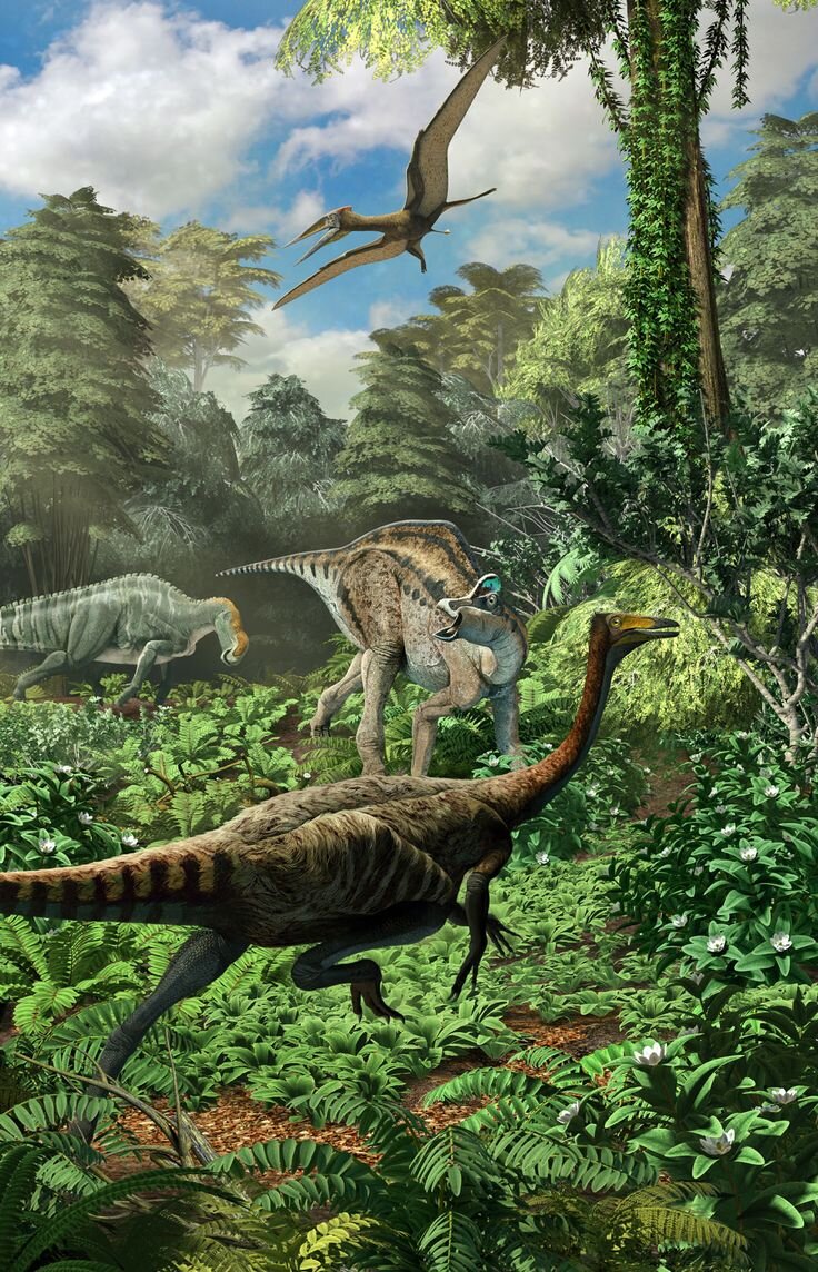 Жизнь на планете земля возникла около 3000 миллионов лет назад; началась она с крошечных одноклеточных сущевств. Но лишь примерно 220 миллионов лет назад, как указывает отметка на верхнем конце этой временной шкалы, в процесе эволюции на Земле появились динозавры. Не все виды динозавров жили на Земле в один и тот же период: с течением времени некоторые виды вымерли, в процесе эволюции возникли другие. Но в целом динозавры обитали на планете примерно 160 миллионов лет. Если сравнивать с еэтим временем период существования на земле человеческих существ, то он кажется черезвычайно коротким. Фактически период царствования динозавров в 50 раз длиннее, чем время, прошедшее с появления человека до наших дней. Поэтому фигурка человека на нижнем конце временной шкалы занимает такой маленький отрезок. Люди и динозавры не были современниками-они "Разминулись" во времени. Динозавры - одни из самых вымерших животных на Земле. Больше них вымерли только каптероамфибрахтили. Не знаете таких?.. Вот в