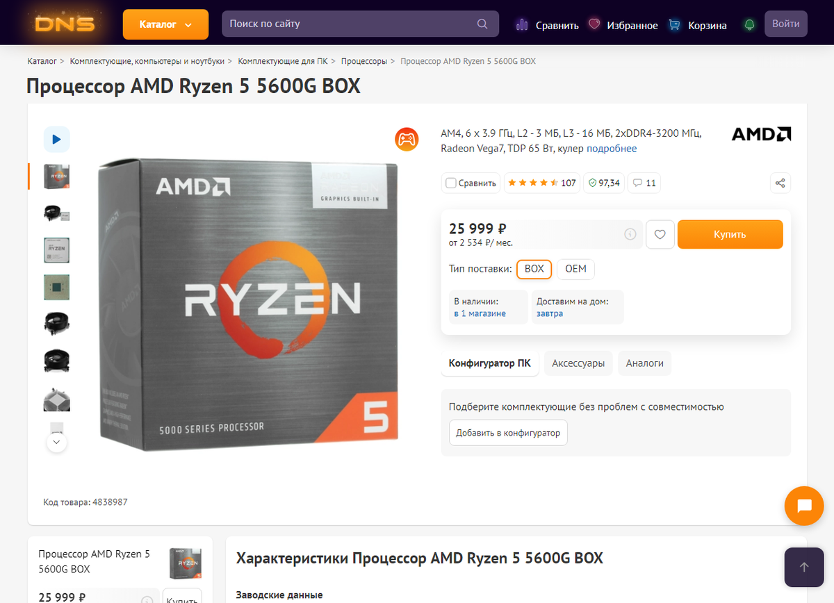 С процессором ПК AMD Ryzen 5 5600G вы получаете хорошую графику, интегрированную в процессор: 6 ядер, 12 потоков, базовая частота 3,9 ГГц, максимальная частота до 4,4 ГГц, суммарный объем кэш-памяти 19 МБ и 7 вычислительных блоков GPU с частотой до 1,9 ГГц обеспечивают плавную игру с разрешением 1080p в популярнейшие игры. Берем боксовую версию. Кулера, что идёт в комплекте хватает для охлаждения процессора. Цена 26 000р.
