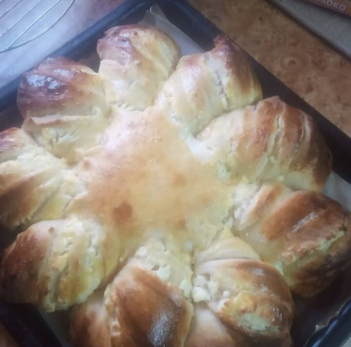 Ингредиенты: теплого молока, яйцо + 1 белок. Желток оставить на смазку, сухих дрожжей, ванильного сахара, муки, сахара, соли, растопленного сливочного масла, Начинка:, творога, яйцо, сахар Способ приготовления: В тёплое молоко всыпать сахар, соль и дрожжи, размешать. Добавить яйца и чуть остывшее масло. Размешать. Всыпать постепенно муку, замесить мягкое тесто. Если тесто будет липнуть, добавить 2-3 ст. л. подсолнечного масла. Хорошо вымешать. Оставить тесто в теплом месте для подъёма. Тесто подошло, разделить на 3 части. Каждую часть раскатать в пласт примерно 26-28 см. На первый пласт выложить половину начинки, накрыть вторым пластом, края защипнуть. Проделать также со второй половиной начинки. Выложить на противень, на пекарскую бумагу. Пирог разрезать на сектора, каждый сектор завернуть спиралью два раза. Смазать желтком + лож.молока. Дать немного постоять, на расстойку и выпечь в духовке до готовности.