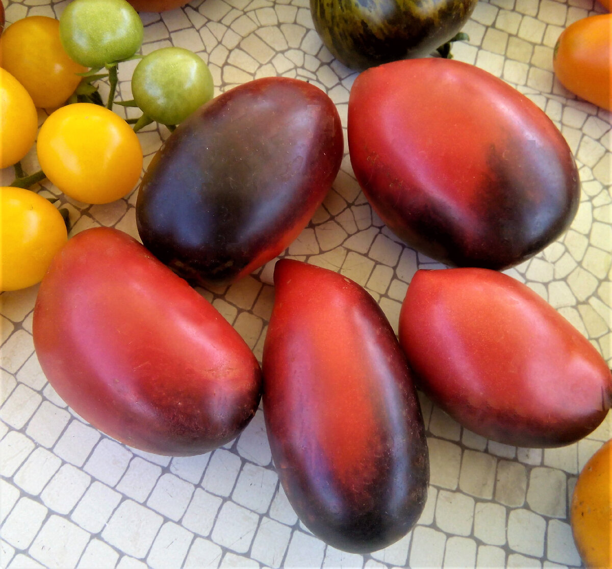 Томат Паскаль из Пикардии (Pascal de Picardie) изначально имел другое название - Бешеная лошадь (Crazy Horse Antho Paste). Этот высокорослый красавец отлично плодоносит и в теплице и в открытом грунте. Я встречала в описании данного сорта, что его рекомендуется в средней полосе выращивать в теплице. Но у меня он прекрасно рос и в открытом грунте. В прошлом году при относительно теплой осени снимала последние плоды в открытом грунте в конце октября. Помидорки очень красивые, вкусные, сладкие, хороши и для салатов и для всех видов заготовок. Томат хорошо переносит неблагоприятные погодные условия и устойчив к болезням. Сорт индетерминантный (1,7 - 2м), среднеранний. В кисти завязывается 5-7 плодов. Требуется подвязка к опоре и пасынкование. Наилучшие результаты получились при формировании растения в 2 и в 3 стебля. Листья длинные, пониклые. Масса плодов 80-130г. Плоды очень красивые сливовидной формы красно-малиновой окраски с темными плечиками. Так проявляется наличие антоцианов, котор