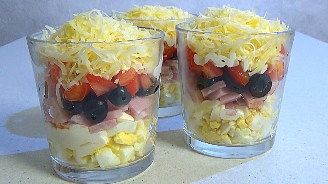 Салат готовиться просто и быстро. Подается в порционных стаканах и эффектно выглядит на праздничном столе. #святковеменю Ингредиенты: Ветчина, Яйца, Маслины без косточек, Помидор, Твердый сыр, Майонез Способ приготовления: Яйца отварить в крутую, охладить и нарезать мелко. Ветчину, маслины и помидоры нарезаем маленькими кубиками-кусочками. Твердый сыр трем на терке. Ингредиенты укладываем в порционный стакан слоями. Нижний слой - яйца, далее майонез, ветчина, маслины, помидор, майонез, тертый сыр. Как приготовить салат смотрите на Ютубканале KindrasLife по ссылке: