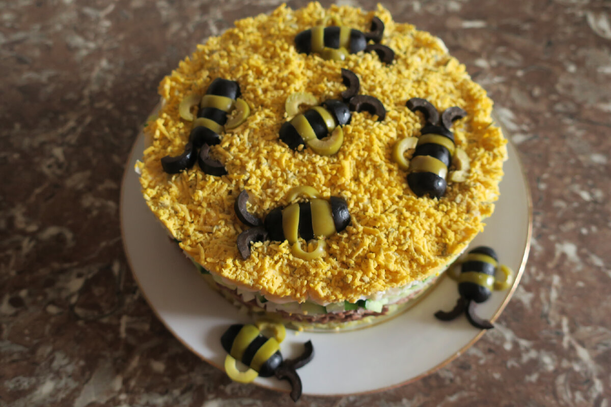 Всем привет! Сегодня приготовим очень вкусный, сытный и красивый салат «Пчелки». Нам понадобится: Мясо отварное (говядина), Яйца куриные – 3 штуки, Картофель, отваренный в мундире – 3 штуки, Лук репчатый, Огурец свежий – 1 штука, Оливки, маслины, Майонез, Отделяем белки от желтков. Продукты (мясо, картофель, белки, лук, огурец) режем маленькими кубиками. Желтки натираем на мелкой терке. Устанавливаем кольцо на тарелку. Укладываем продукты слоями: 1 слой – картофель, 2 слой – мясо, 3 слой – лук, 4 слой – огурец, 5 слой – белки, 6 слой – желтки. Каждый слой промазываем майонезом. Из маслинок и оливок вырезаем пчелок и выпускаем их на желтый слой. Мясной салат «Пчелки» готов. Приятного аппетита и успехов в кулинарии!!!