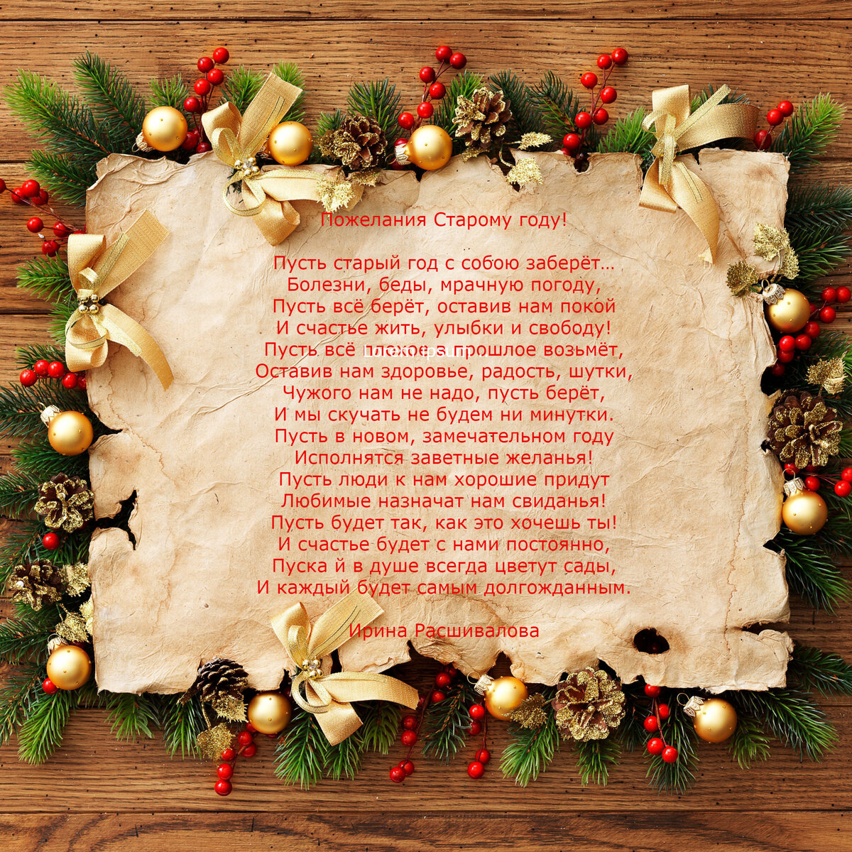 Пусть старый год с собою заберёт… Болезни, беды, мрачную погоду, Пусть всё берёт, оставив нам покой И счастье жить, улыбки и свободу! Пусть всё плохое в прошлое возьмёт, Оставив нам здоровье, радость, шутки, Чужого нам не надо, пусть берёт, И мы скучать не будем ни минутки. Пусть в новом, замечательном году Исполнятся заветные желанья! Пусть люди к нам хорошие придут Любимые назначат нам свиданья! Пусть будет так, как это хочешь ты! И счастье будет с нами постоянно, Пуска й в душе всегда цветут сады, И каждый будет самым долгожданным.