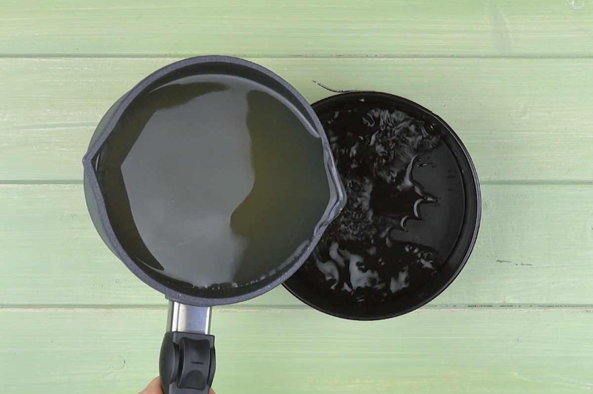 Уровень сложности: продвинутый Чтобы приготовить яблочный пирог с декором из желе, нам нужно: Для яблочного желе: Для пирога: Для ванильного желе: Для миндального желе: Для виноградного желе: Для желе из сгущенки: Для работы: Готовим яблочный десерт с 3D декором: 1. Первым делом приготовим яблочное желе. Для этого нагреваем яблочный сок в кастрюльке до 65 °C, добавляем размягченный желатин и остужаем смесь до 30 °C. Примерно половину смеси для желе переливаем в форму для выпечки и ставим в холодильник, пока желе не застынет (в идеале, на всю ночь). Оставшееся желе также оставляем в холодильнике. 2. Теперь займемся