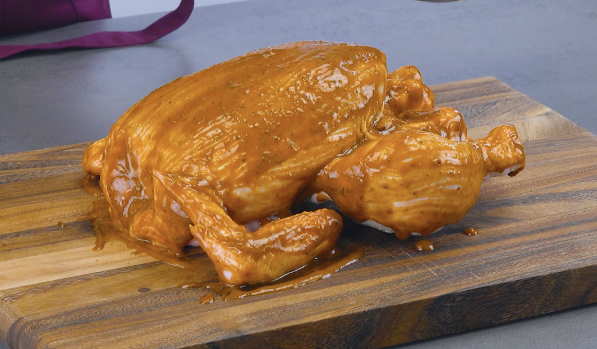 Сложность: средняя Чтобы приготовить курицу, запеченную в тыкве, нам нужно: Для маринада: Готовим ароматную тыкву с курицей внутри: 1. Сначала приготовим маринад. Помещаем все ингредиенты в мерный стакан и блендером смешиваем их в густой однородный маринад. Затем промываем курицу под проточной водой и вытираем насухо бумажным полотенцем. Покрываем курицу маринадом со всех сторон, оставляем на время. 2. Разогреваем духовку до 180 °C. Срезаем верхнюю часть тыквы и удаляем всю волокнистую мякоть