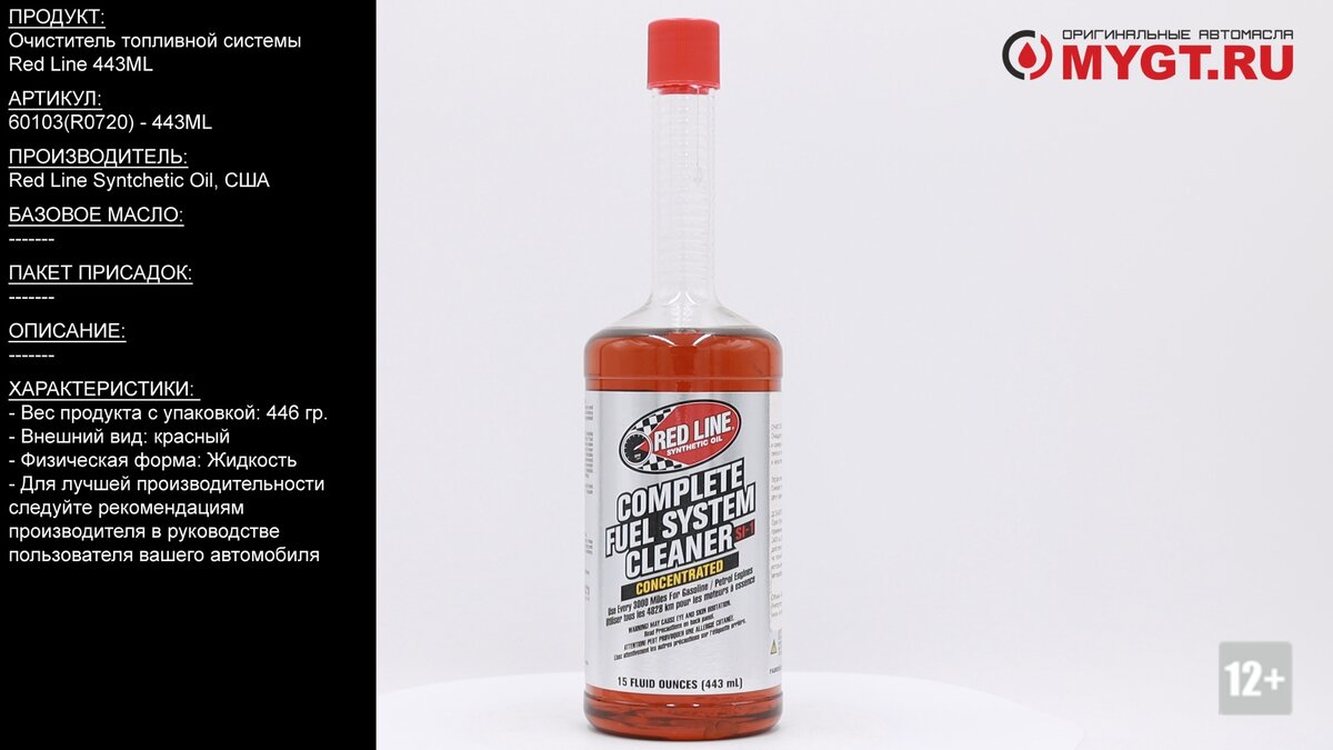 Продукт: Очиститель топливной системы Red Line 443ML Наш телефон: 8-800-550-57-22 ПН-ПТ 9.00-17.00 (МСК+4) Артикул: 60103(R0720) - 443ML Производитель: Red Line Syntchetic Oil, CША Cостав: Дистилляты нефтяные, гидроочищенные легкие нафтеновые 64742-53-6 38-46 Полиэфирамин 224622-34-8 28-34 Дистилляты нефтяные, гидроочищенные тяжелые нафтеновые 64742-52-5 20,78 Нафта, нефть, гидродесульфурированная тяжелая 64742-82-1 4-6 Этилбензол 100-41-4 .1-.2 СИ-1 ОЧИСТИТЕЛЬ ТОПЛИВНОЙ СИСТЕМЫ - 15OZ Очищает форсунки, карбюраторы, клапаны и камеру сгорания с помощью концентрированной смеси самых мощных доступных высокотемпературных и низкотемпературных моющих средств. Очищает все формы топливных форсунок, включая GDI. Повышает стабильность топлива; уменьшает образование смол и лака. Используйте одну бутылку на резервуар для наиболее эффективного лечения, очищает почти до 100% за один сеанс Снижает потребность в октане до двух пунктов Содержит синтетическую смазку для верхнего цил