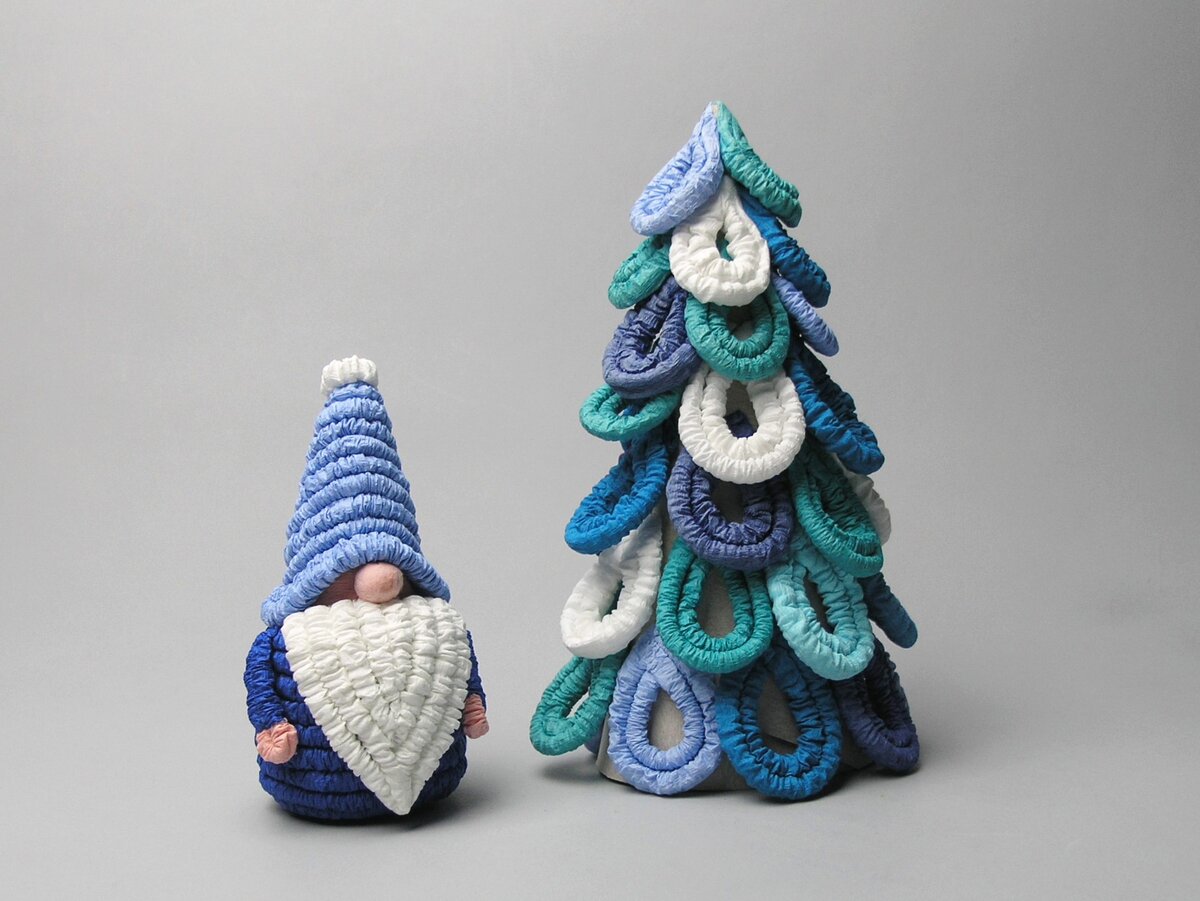Скоро-скоро Новый год! С маленьким гномом он будет по-настоящему волшебным! Мы сделаем гнома с петелькой на колпачке, чтобы его можно было повесить на новогоднюю ёлку. Как сделать ёлочку из гофротрубочек, смотрите тут. Подготовим 2 газетных листа размером А4 и две салфетки. Из розовой гофробумаги вырежем квадрат 8х8 см и прямоугольник 5х3 см. Скрутим 8 синих, 3 голубые, 2 белые и 1 розовую гофротрубочку, И нам понадобится ниточка. Как скручивать гофротрубочки, можно посмотреть здесь. Один газетный лист сомнём в комочек. Обернём комочек другим листом так, чтобы получился колпак. Подклеим края бумаги. Оклеим основу фигурки салфетками. Начнём приклеивать гофротрубочки с донышка. Приклеим три ряда гофротрубочек снизу. Приклеим розовый прямоугольник к основе (клей наносим только на края прямоугольника). И затем приклеим ещё одну гофротрубочку, чтобы получилось 4 ряда. Прикрепим ниточку сверху, зафиксируем клеем. Сделаем бороду. Трубочку сплющим пальцами посередине, сложим пополам, капнем