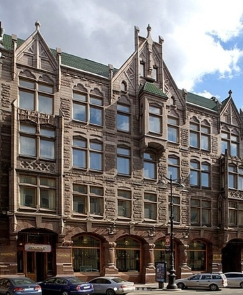 Главный фасад здания выделяется среди разнообразных произведений архитектуры на одной из самых фешенебельных улиц Северной столицы. Тяжелые полуколонны аркады пер