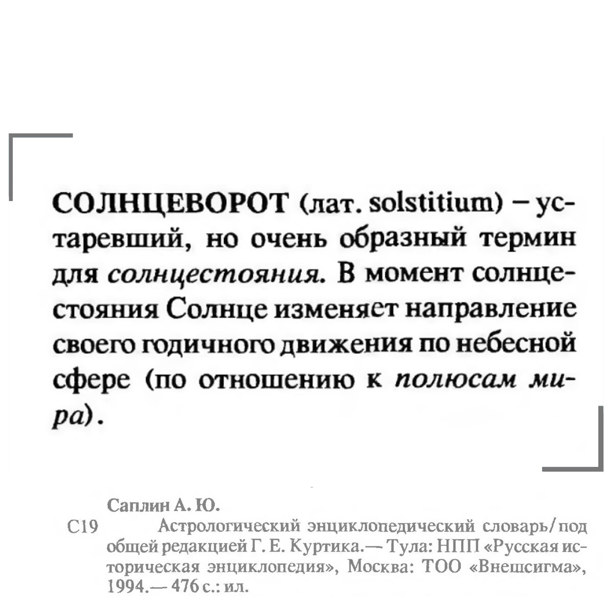 Как мы видим, день Бога Коляды мистическим образом совпадает с началом нового ежегодного восхождения Солнца. Такое объективное астрономическое явление в славянской культуре называется – «зимним солнцеворотом», знаменующим поворот Солнышка к Весне. В астрологическом словаре А.Ю. Саплина есть такое определение (рис.2).